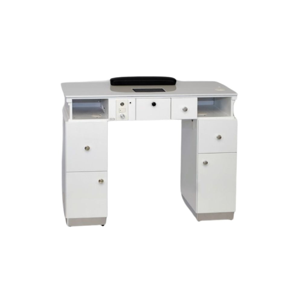 Elevate your salon with our exquisite manicure station featuring dual-stage dust extraction and a sleek glass-ceramic tabletop adorned with vibrant RGB LED lighting. Experience ultimate functionality and style with concealed cable management and clever dual nail lamp openings, making it a must-have for modern salons.