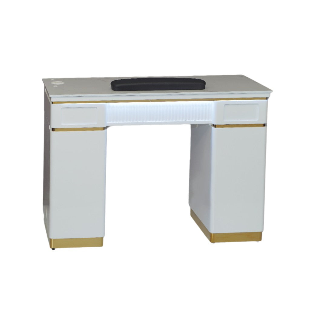 Transform your salon with the Midas nail table, a perfect fusion of modern elegance and timeless luxury. Featuring a pristine white finish with exquisite gold trim and hardware, this sophisticated piece is designed to impress. The sleek ceramic top with a marble effect and ambient LED lighting adds a touch of refinement, making it an essential statement piece for any upscale salon.